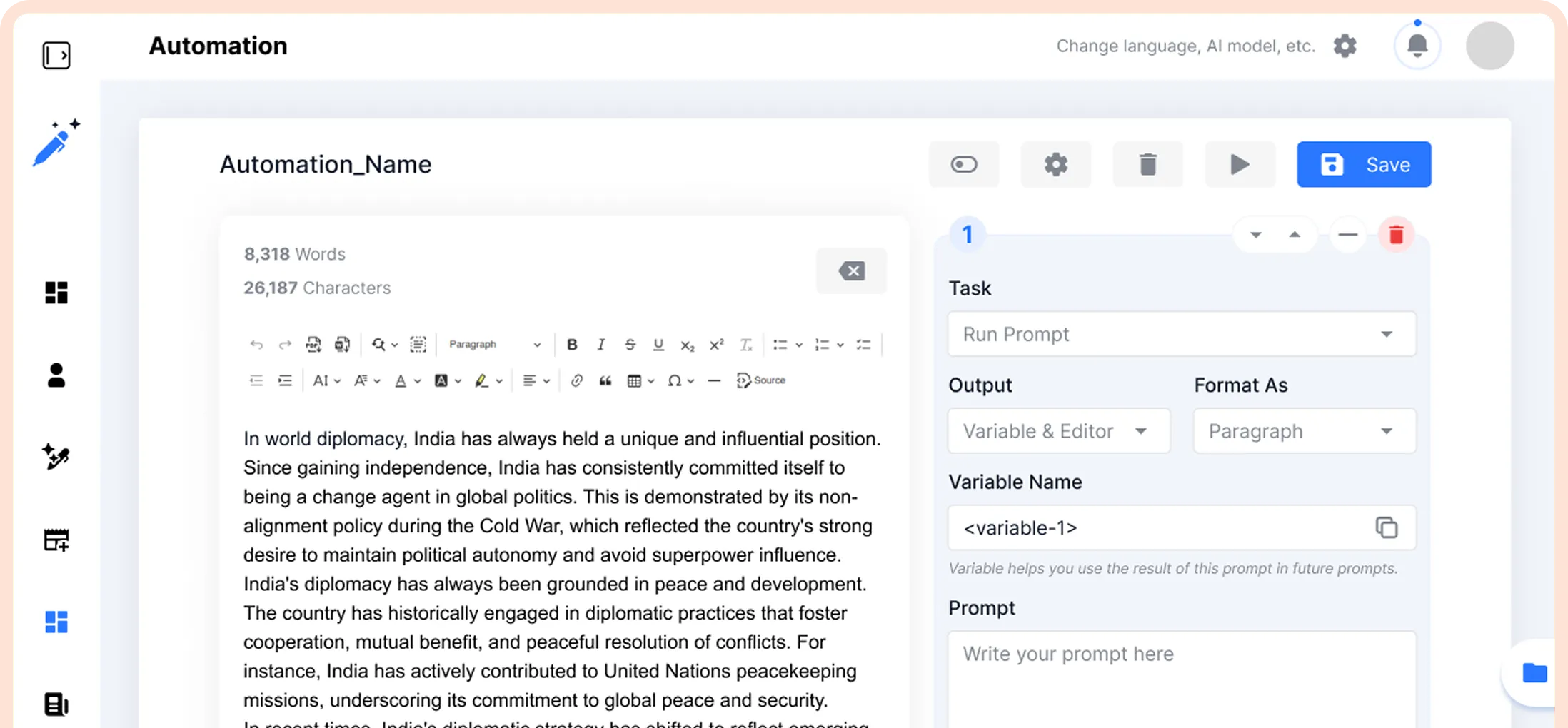 Ever wished you had a personal writer who just gets you? With our Automation Builder, now you do. Build your own custom AI writer, pick the tone, style, SEO settings, and everything in between, then watch it create content exactly the way you want. Blogs, articles, or marketing copy, it handles it all while you sit back and focus on ideas that matter. Fast, flexible, and totally in your control, it’s like having a writing partner who never sleeps.